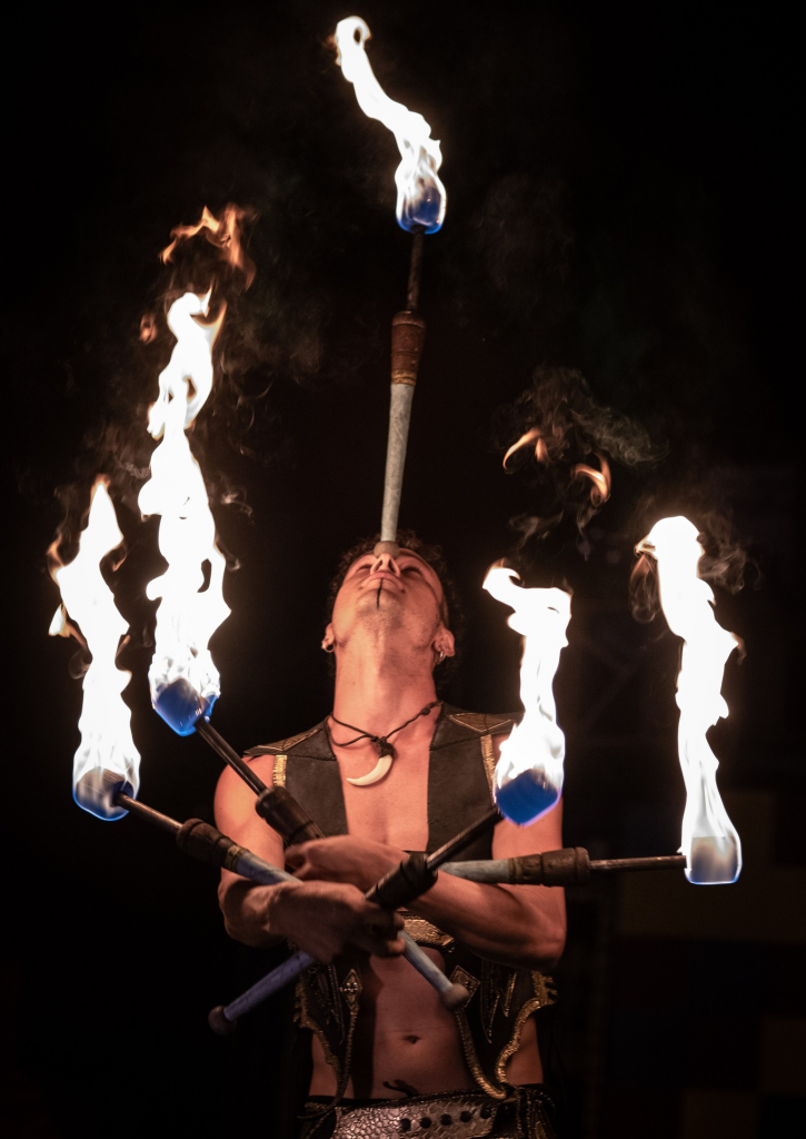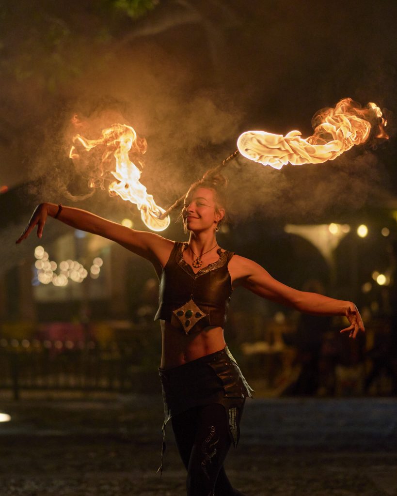 This of course is mostly reflected in Solo – acts like when Gory is doing astonishing variations with fire staff and torches and surprises with his contemporary style with clubs and balls – or when Mascha is performing with fire fans or her contact staff using her acrobatic skills and flexibility; as well as performing in the air on silks or vertical rope.